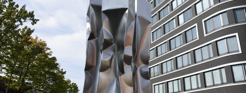 Schon seit Juni begrüßt die Beschäftigten und Besucher des EUREF-Campus auf der Zufahrt über die Torgauer Straße eine sechs Meter hohe, zwei Tonnen schwere und aus drei Millimeter feinstem Stahl bestehende dreiteilige Skulptur, die im Sonnenschein wie eine Lichtsäule erstrahlt. Heute, am 8. Oktober, wurde in Anwesenheit des in den Niederlanden lebenden 83-jährigen Künstlers Ewerdt Hilgemann und seiner Frau Antoinette de Stigter die Skulptur feierlich enthüllt.