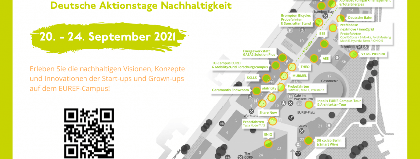 Vom 20. bis 24. September 2021 fanden auf dem EUREF-Campus die „Deutschen Aktionstage Nachhaltigkeit“ (DAN) statt. 22 Unternehmen, die auf dem Campus ansässig sind, beteiligten sich daran mit Präsentationen und Vorträgen und gewährten einen Blick hinter die Kulissen.