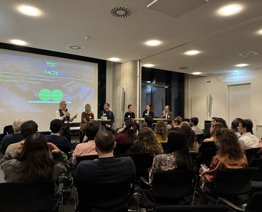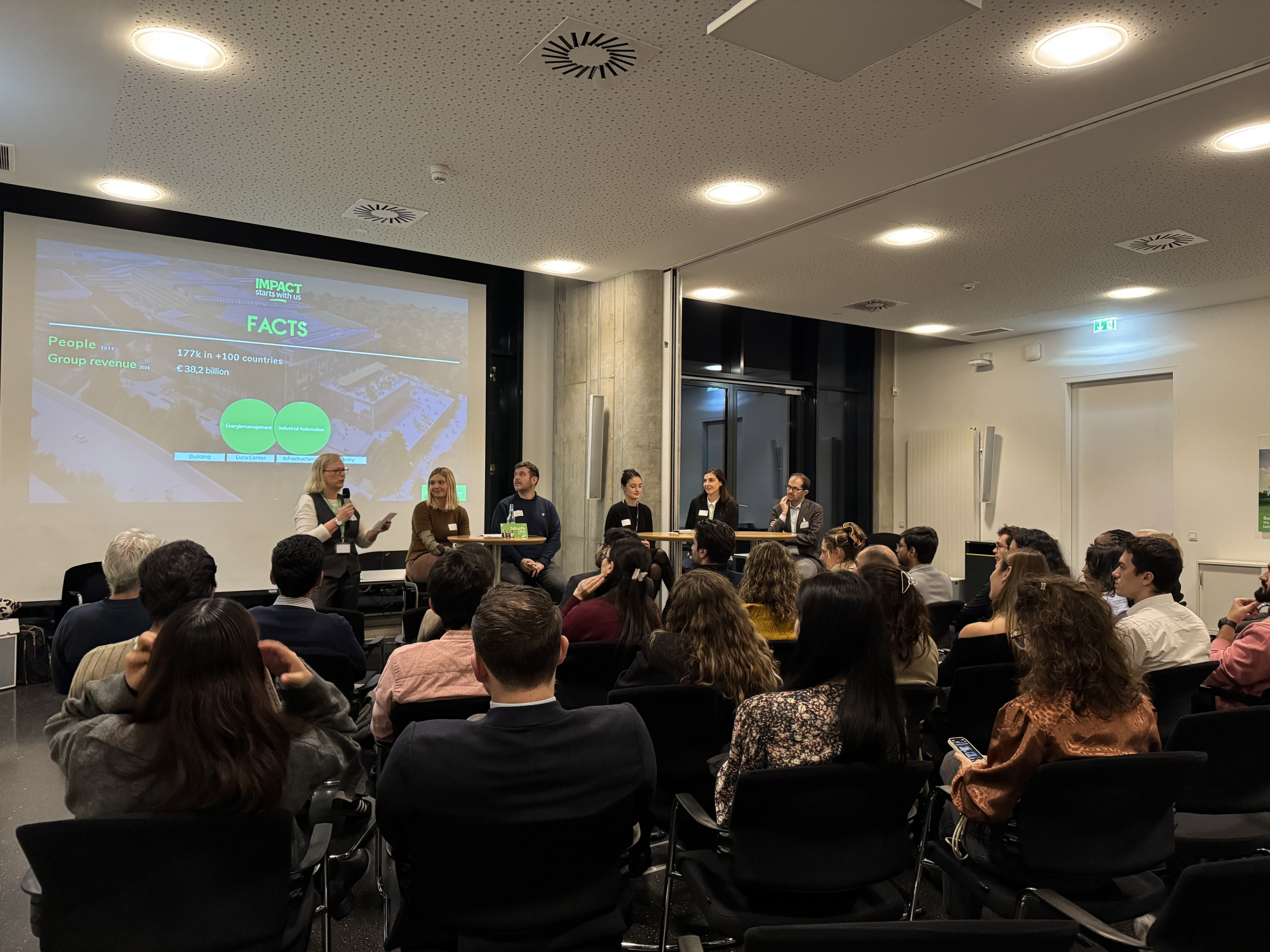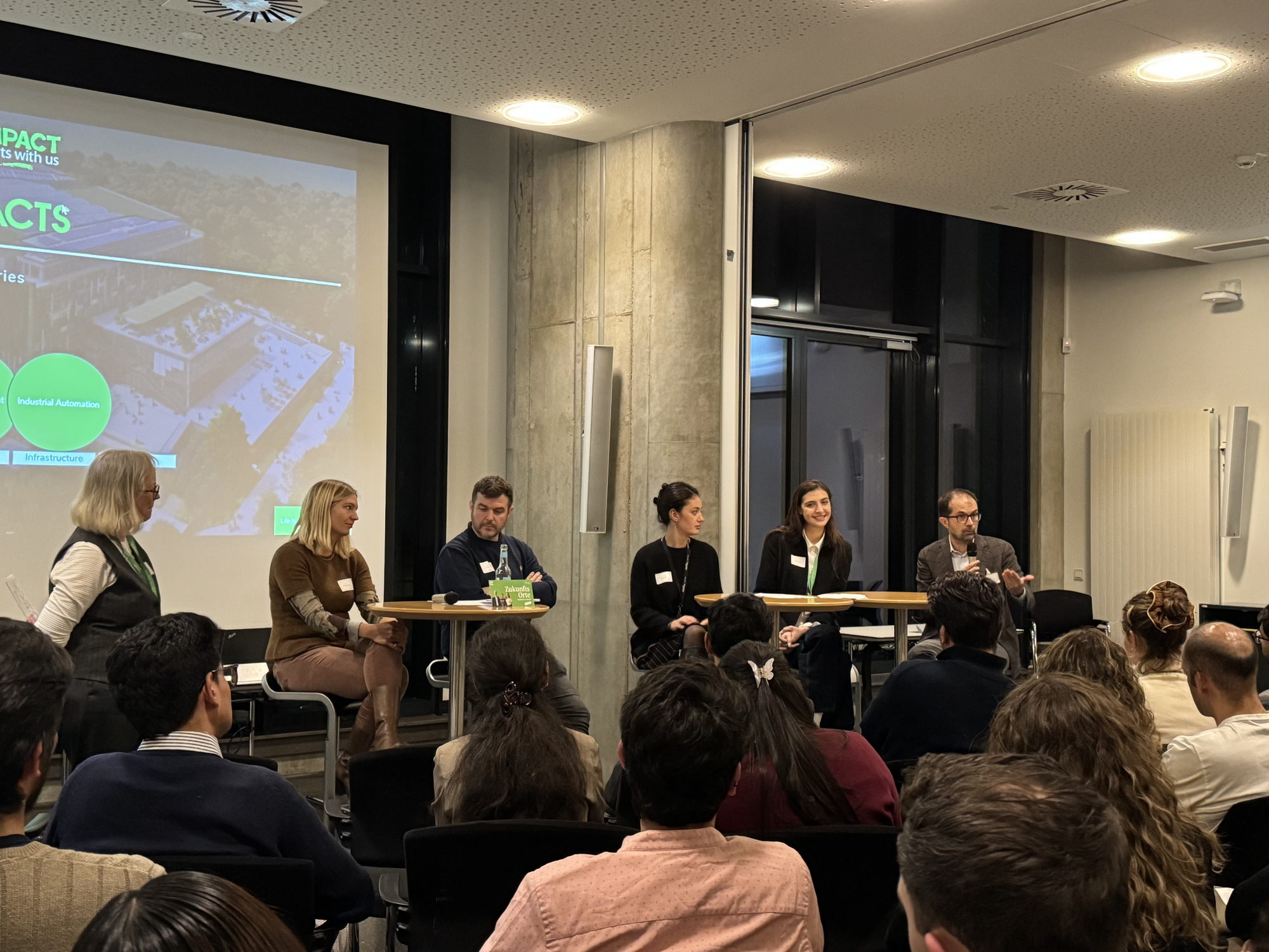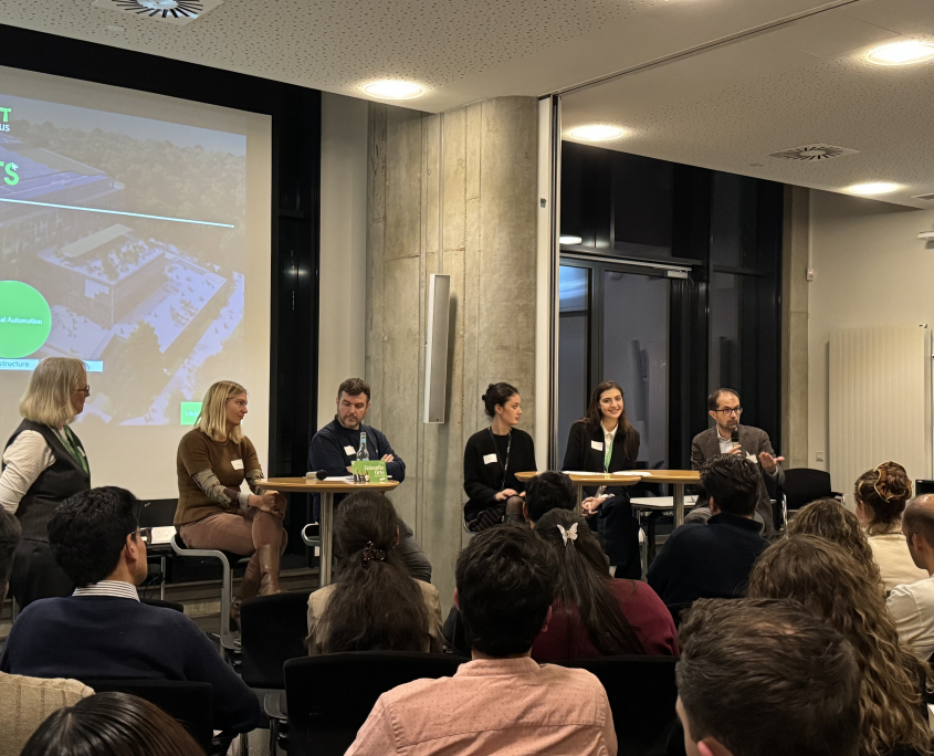 Begrüßt wurde die Gruppe von Gabriele van Laar-Rossa, Head of University Relations bei Schneider Electric. Auf dem Panel sprachen außerdem Charlotte Ritter (Senior Consultant & Innovation Managerin, inno2grid), Dr. Massimo Moraglio (TU Berlin), die MBA-Studentinnen Begüm Diker und Ana Mamaladze sowie Guillaume Pioger (Employer Branding, Schneider Electric).